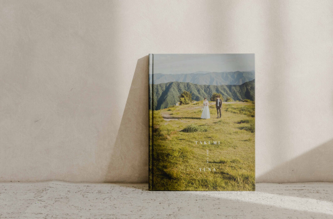 オシャレなレイアウトで楽しむ、今イチオシの縦アルバム。飾って、インテリアにもなるし、かさばらないのも魅力です。前撮りのアルバムとして、結婚式当日のウェルカムスペースに飾っていただけます。